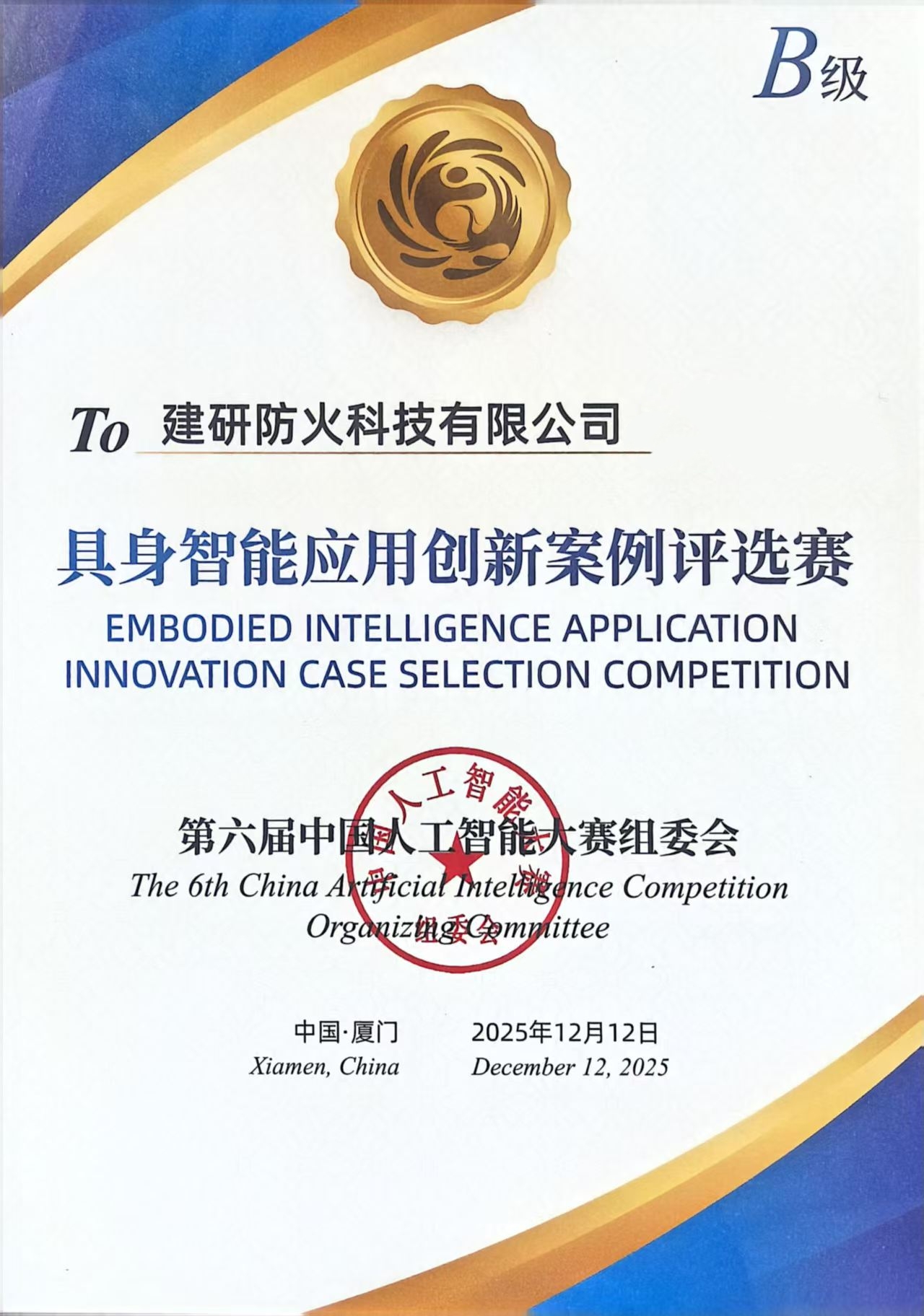 近日,由厦门市人民政府主办,国家互联网信息办公室、公安部指导的“第六届中国人工智能大赛”圆满落幕。建研防火积极组织团队参赛,凭借创新案例《具身智能机器人(犬)重塑火灾现场生命疏导新范式》,在竞争激烈的“具身智能应用创新案例评选赛”中脱颖而出,荣获大赛B级奖项。