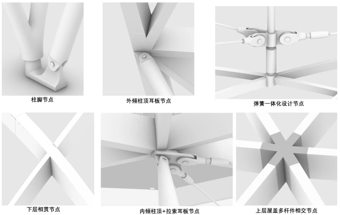 为达到结构性能最优化,在“刚”与“柔”的博弈之下,项目团队最终采用弹簧构件将上、下两层屋盖柔性连接起来,设置合理刚度的单向受压弹簧,一方面可使刚度大的上部帆屋盖对刚度相对较小的泡泡采光顶起到吊挂作用,另一方面还可减小帆屋盖在可变荷载下对泡泡采光顶的压力,取得了良好效果。