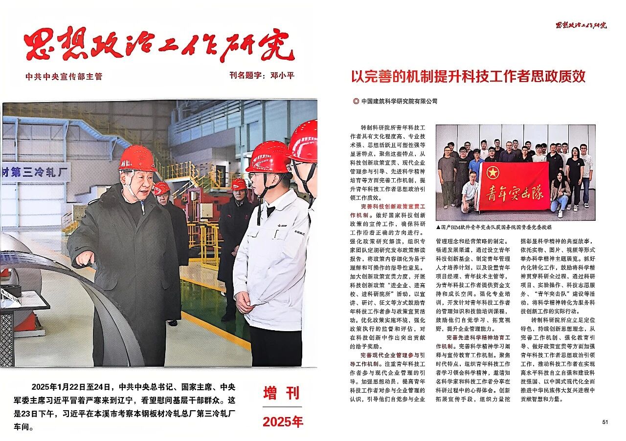 近期,由中共中央宣传部主管的《思想政治工作研究》(2025年增刊)刊发中国建研院科技工作者思政工作创新案例《以完善的机制提升科技工作者思政质效》,文章提出应从科技创新政策宜贯、现代企业管理参与引导、先进科学精神培育等方面完善工作机制,提升转制科研院所科技工作者思想政治引领工作质效,为推动科技工作者在实现高水平科技自立自强和建设科技强国、以中国式现代化全面推进中华民族伟大复兴进程中贡献智慧和力量。