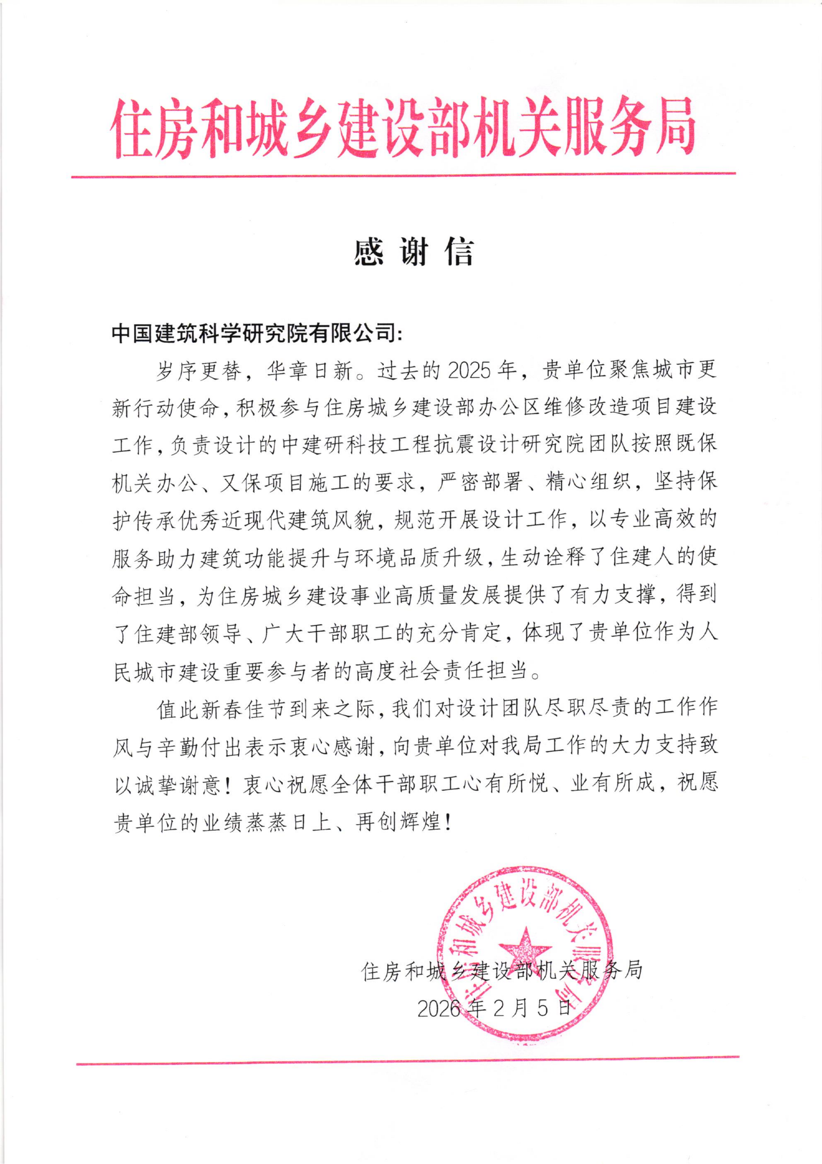 近日,住房城乡建设部科技与产业化发展中心、机关服务局发来感谢信,分别对中国建研院在2025年好房子科技展相关工作中作出的突出贡献表示诚挚感谢对中国建研院所属中建研科技相关项目团队积极参与部办公区维修改造项目的建设工作给予肯定和感谢