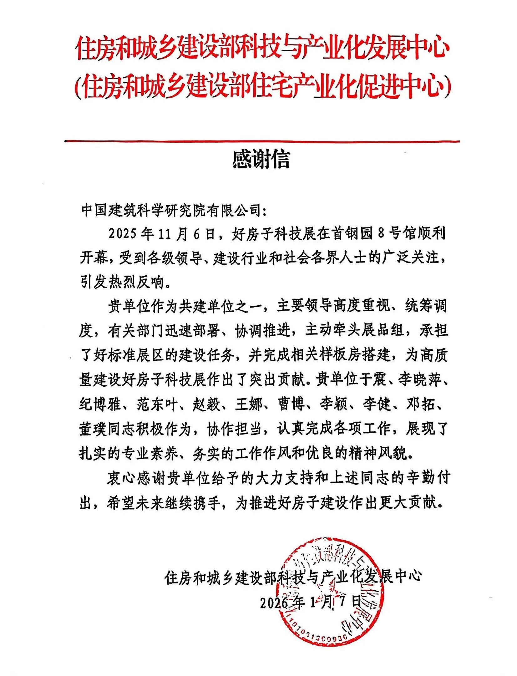 信中表示,中国建研院作为共建单位之一,主要领导高度重视、统筹调度,有关部门迅速部署、协调推进,主动牵头展品组,承担好标准展区的建设任务,完成相关样板房搭建,为高质量建设好房子科技展提供了有力支撑。